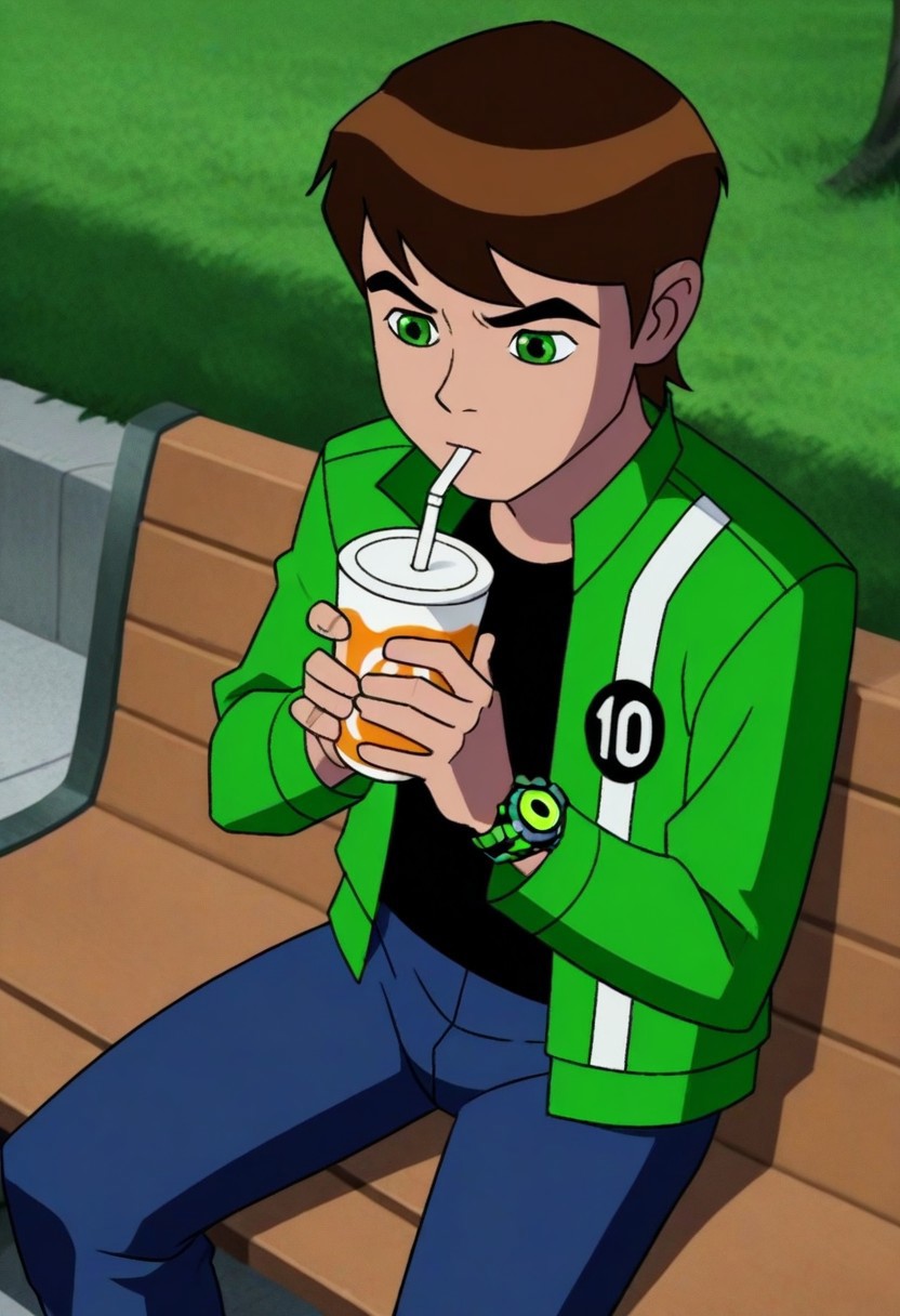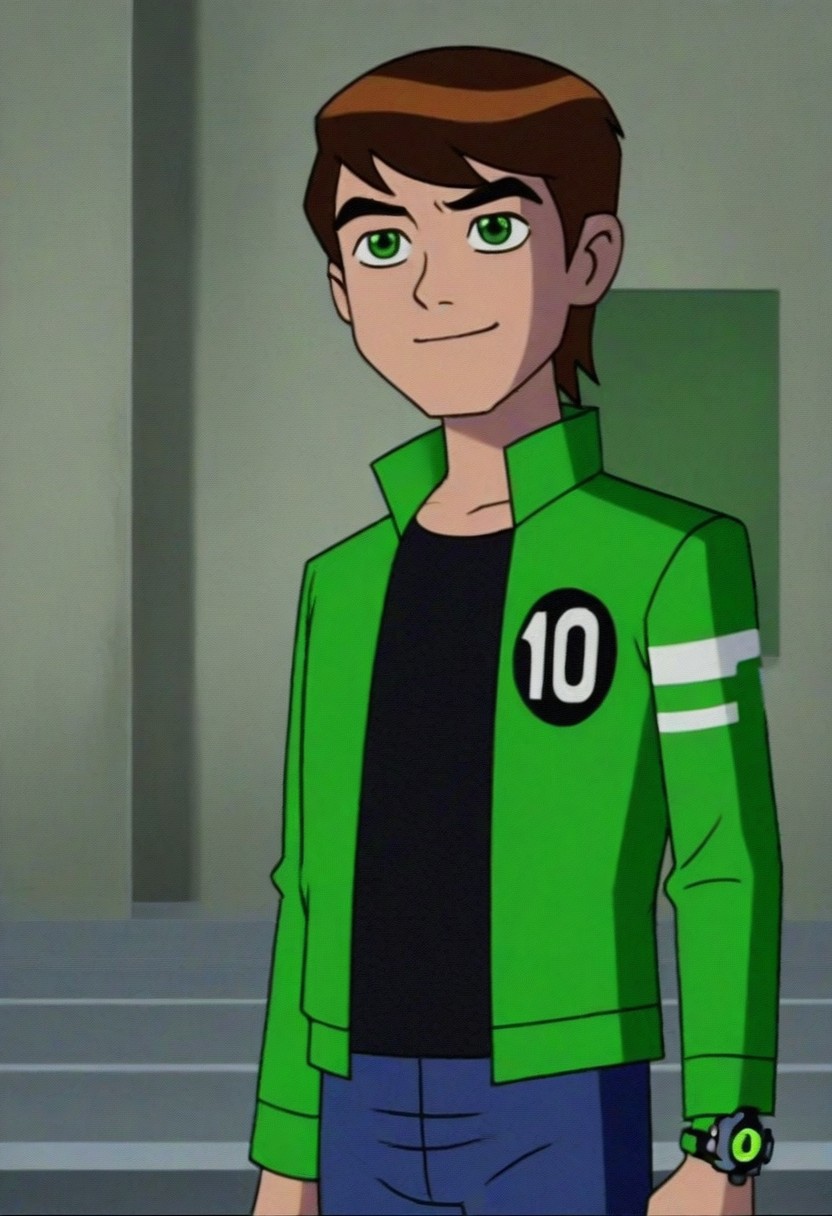 Ben Tennyson, brown hair, green eyes, green open jacket, long sleeves, number 10, black undershirt, Omnitrix watch, blue pants