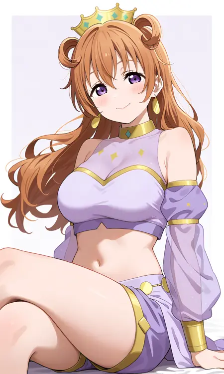 • kanata konoe \(love live\), brown_hair, detached_sleeves, purple eyes, earrings, jewelry, long hair, midriff, navel, purple shirt, purple shorts, short shorts, see-through cleavage, crop top, official alternate costume