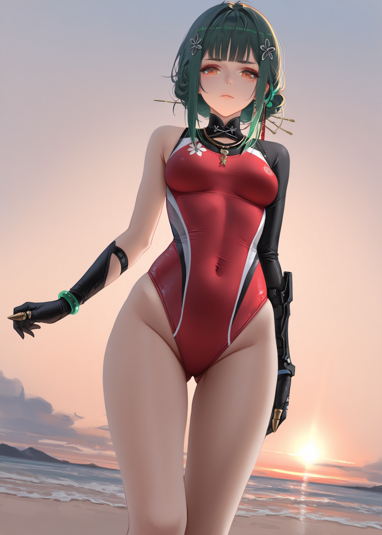 -->1girl, ヘアオーナメント, 緑色の髪 + ジュエリー(任意)ズィーサーウォー衣装