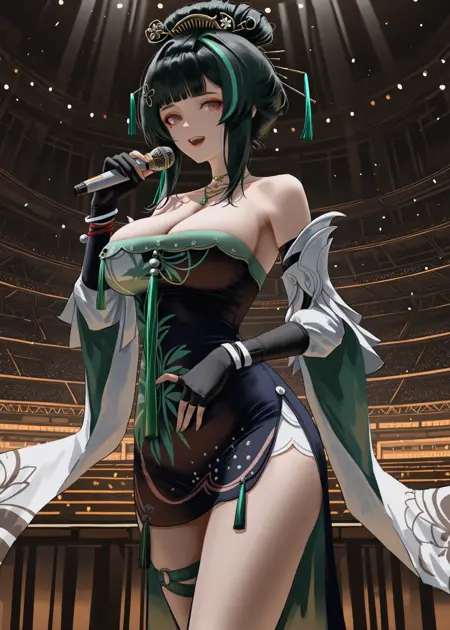 -->1girl, ヘアオーナメント, 胸, 胸元, 大きな胸, ドレス, ヘアオーナメント, グローブ, 緑色の髪, hanying_zitherwoe, ジュエリーソラセチューン衣装