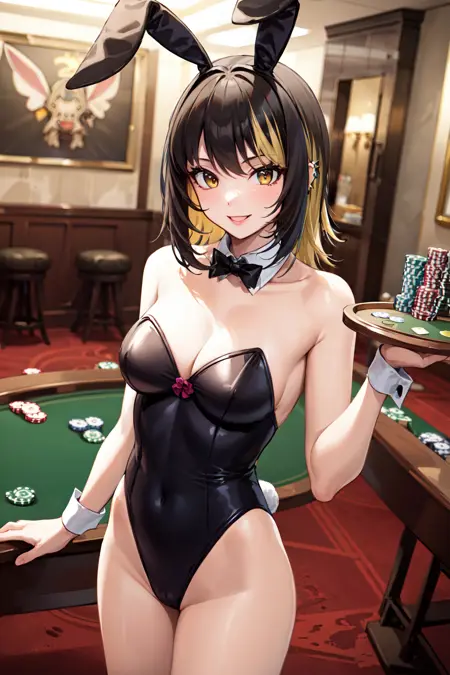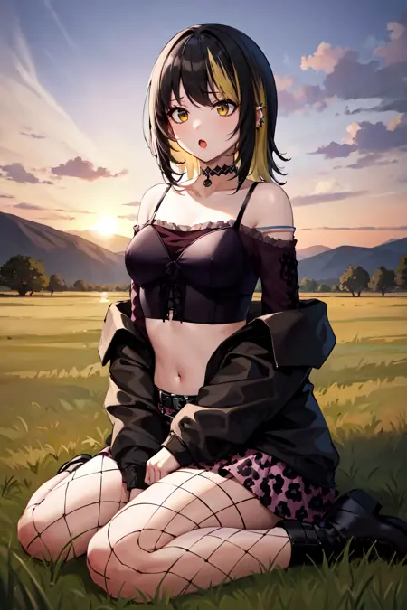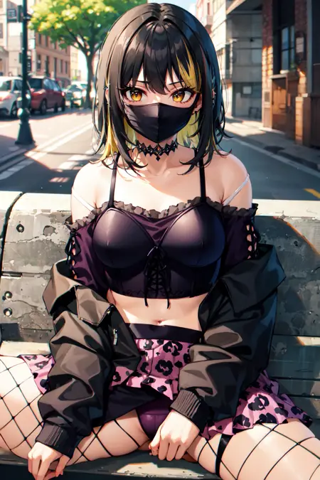 outfit1aaluca, medium hair, multicolored hair, piercing, medium breasts, choker, collarbone, off shoulder, black shirt, black jacket, midriff, animal print, miniskirt, purple skirt, fishnet pantyhose