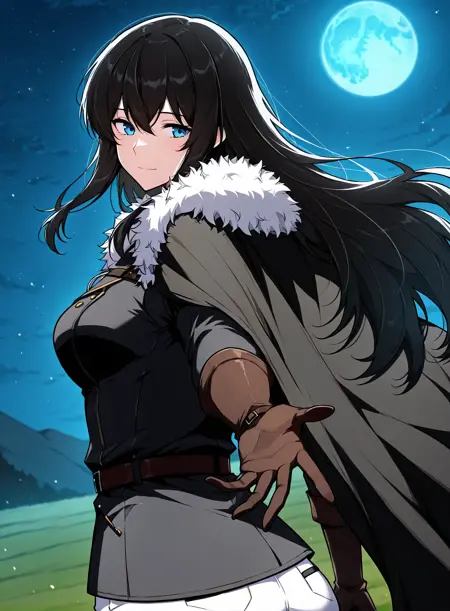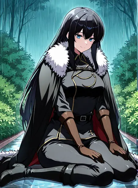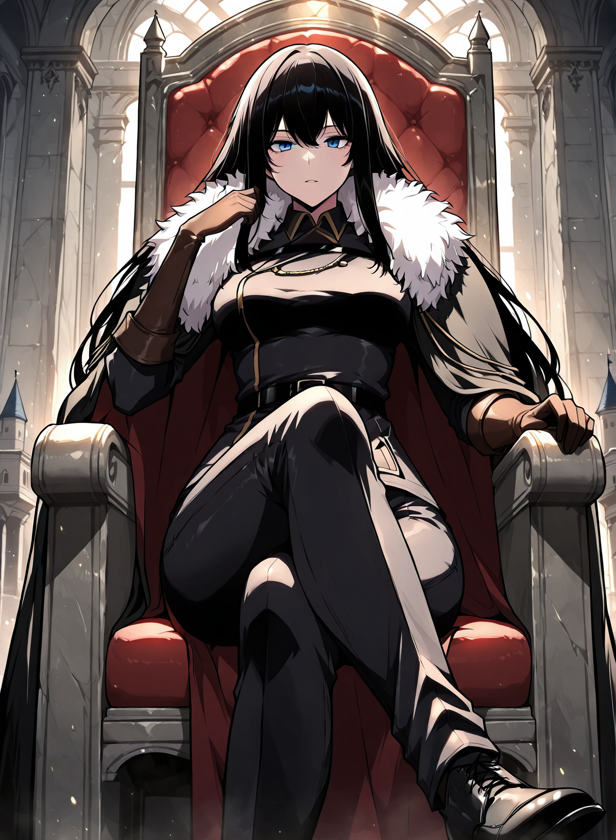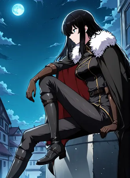 black jacket, black uniform, black gloves, uniform, black cape, black shoes, black pants, jacket, elbow gloves, belt, brown gloves, fur-trimmed cape, high boot