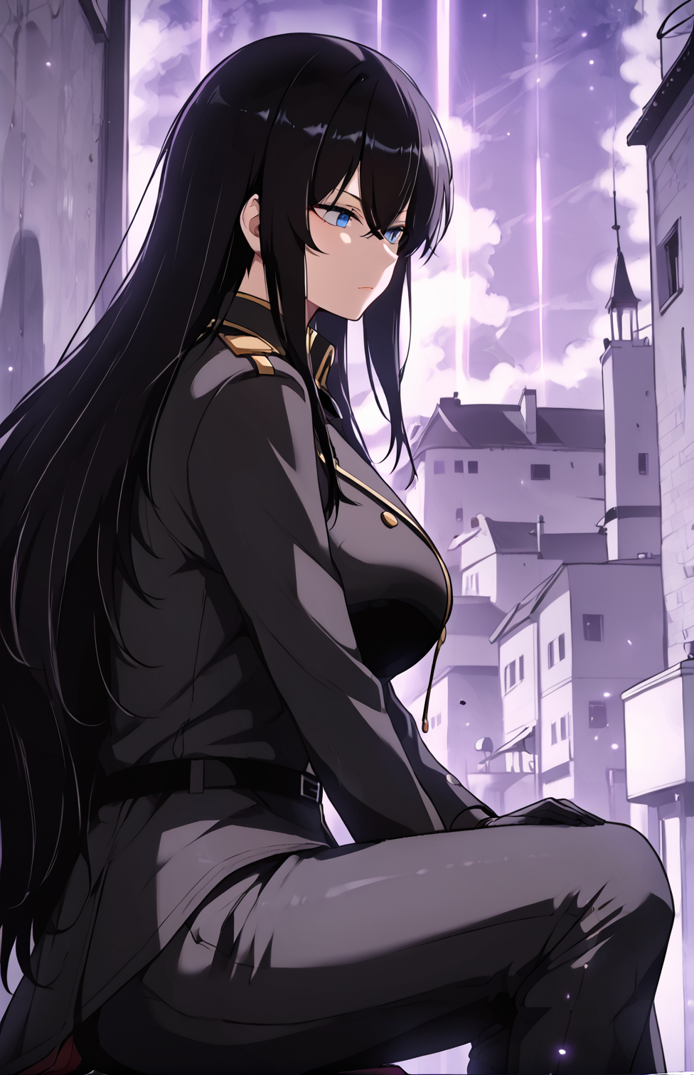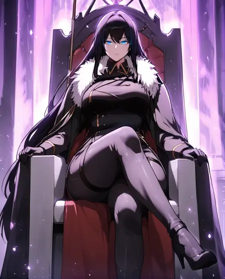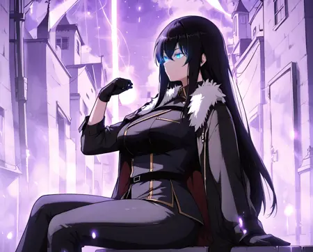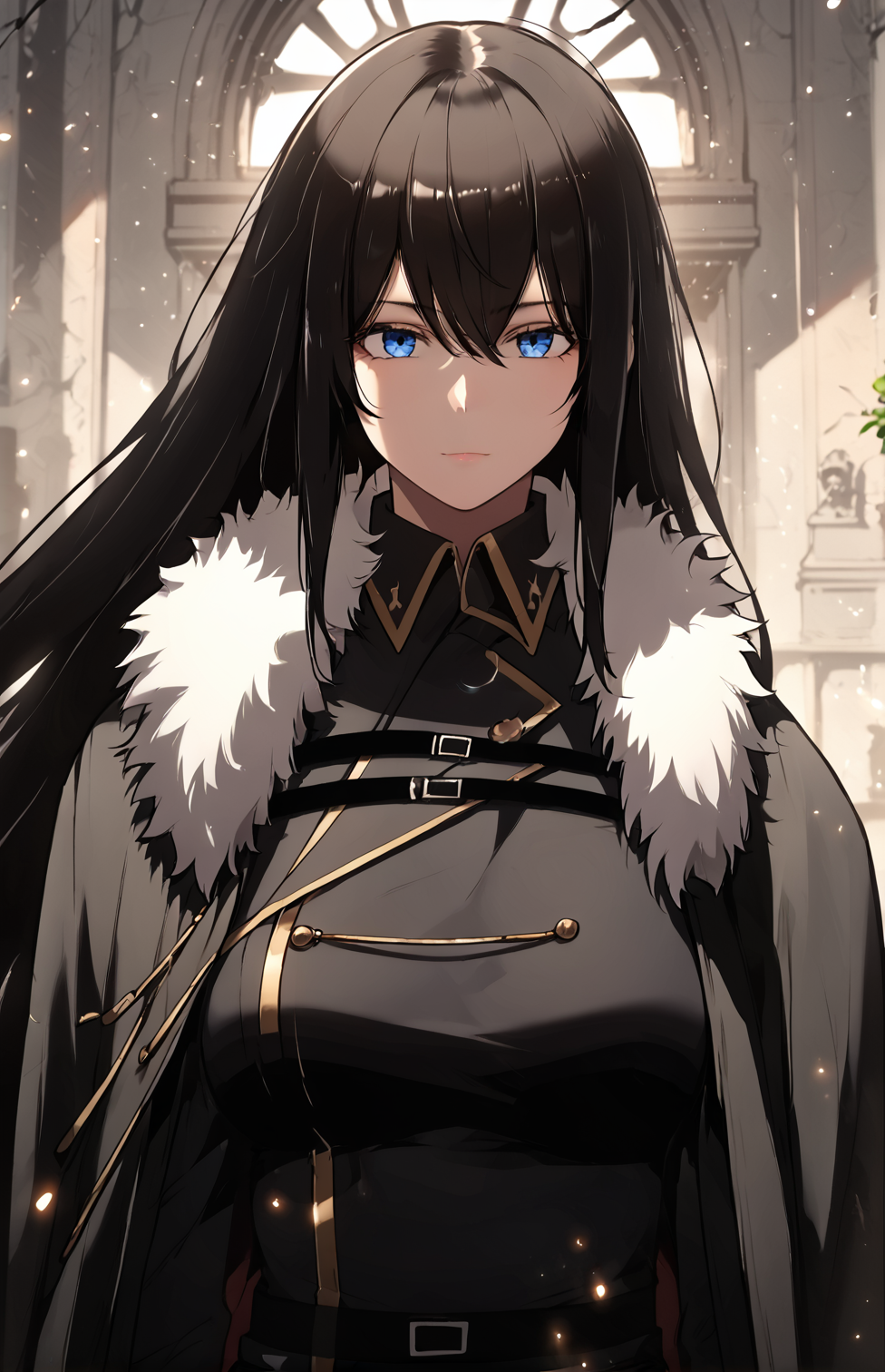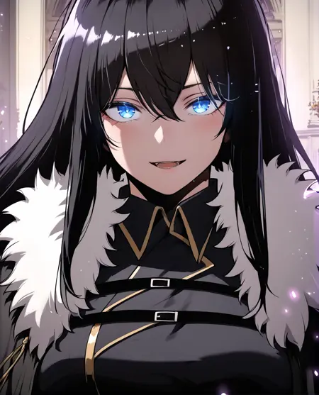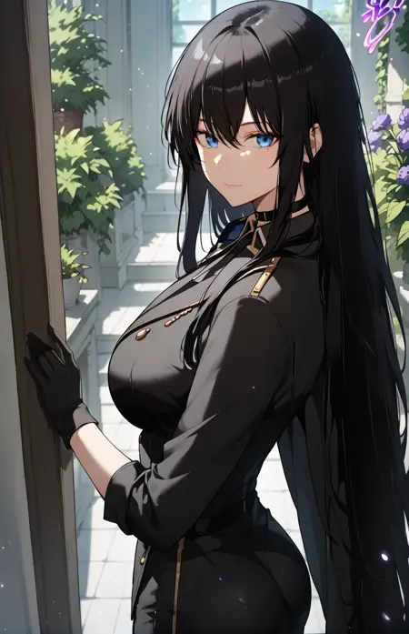 blue eyes, glowing eyes, long hair, black hair, loose hair, hair between the eyes, bangs, sidelocks, big breasts