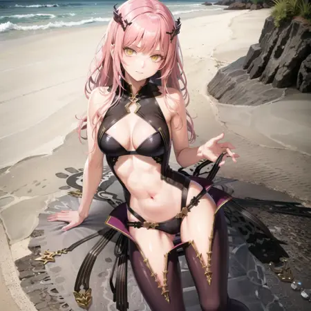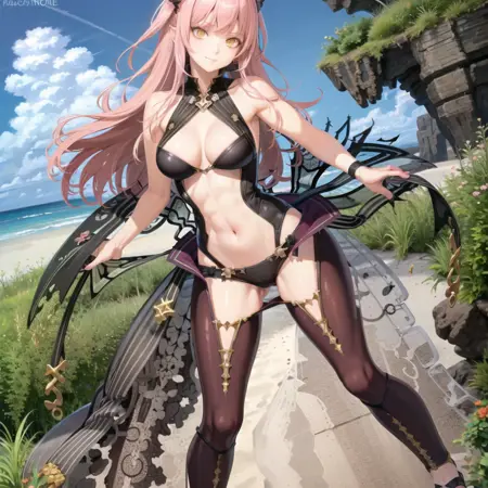 the female character is wearing a purple outfit and a black bodysuit, 1girl, solo, pink hair, long hair, sandals, navel, yellow eyes, outdoors, beach background, posing,