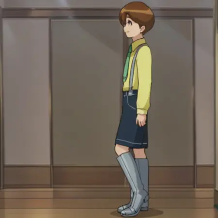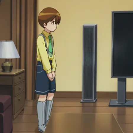 提示:男性,棕色头发,棕色眼睛,黄色领衬衫,长袖,绿色领带,背带裤,短裤,过膝靴,室内(客厅/桌子/沙发/台灯/盆栽/音箱/电视/门),室内(舞蹈室/窗户/墙镜/镜中反射),室内(卧室/窗户),户外(社区/树)