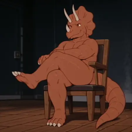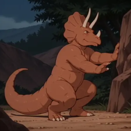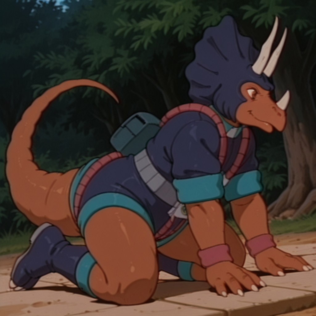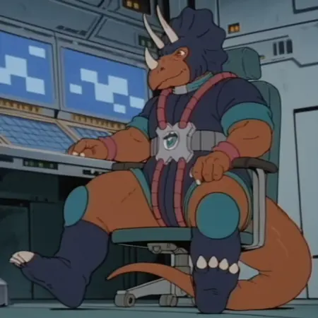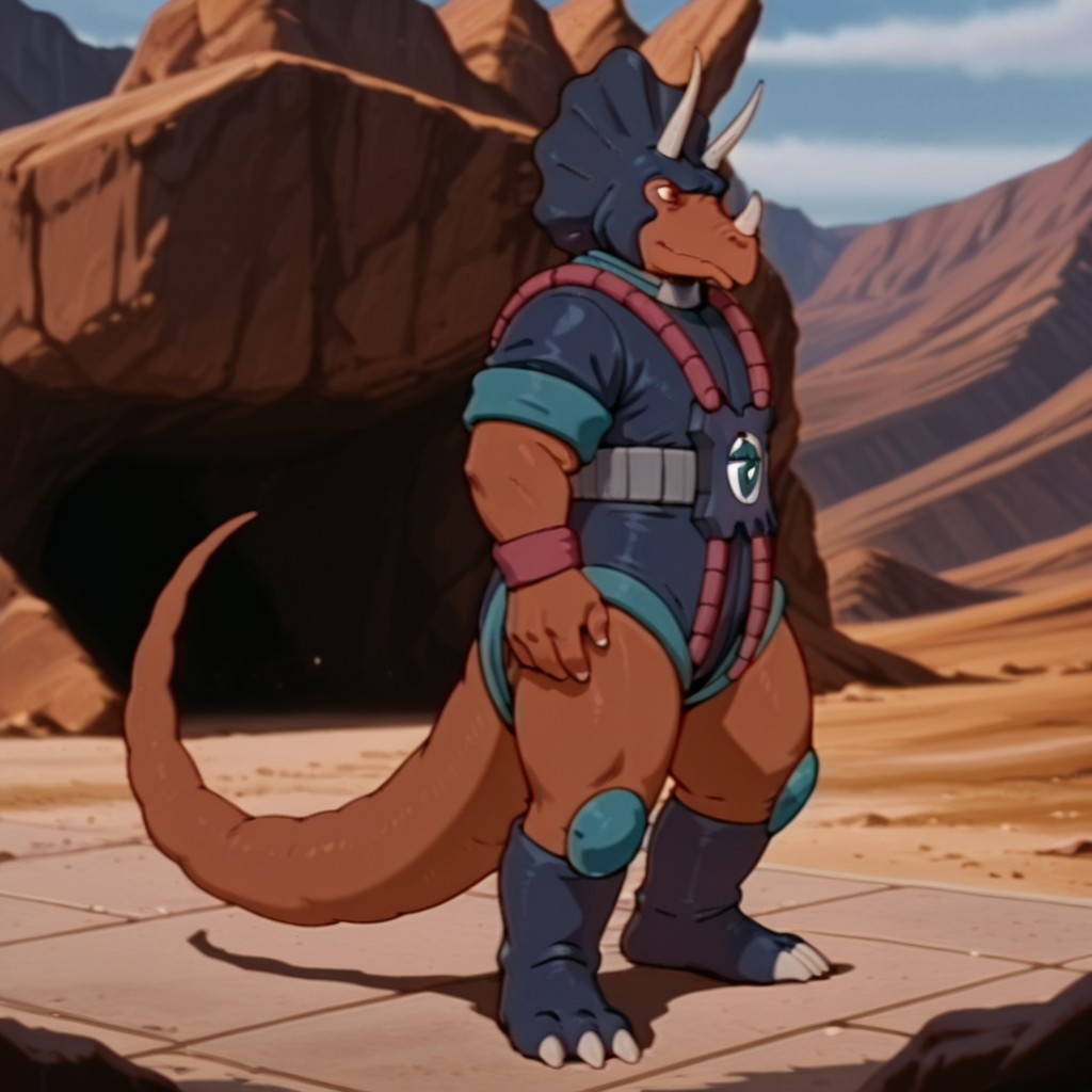 TriceroDsil, anthro, male, Triceratops, brown skin, brown eyes, dark blue helmet, dark blue bodysuit, teal trim, rolled sleeves, red wristbands, teal kneepads, dark blue boots, claws,
