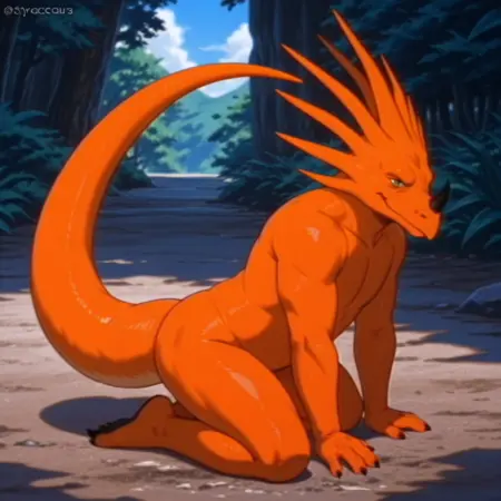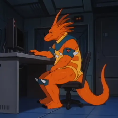 StyracoDsil, anthro, male, Styracosaurus, orange skin, black nose horn, green eyes, yellow leotard, blue trim, blue armbands, blue kneepads, white spikes,