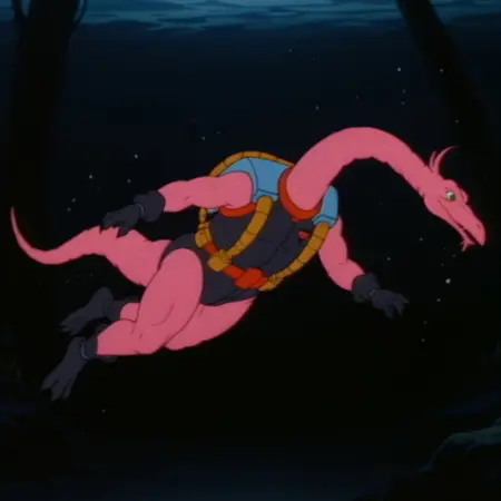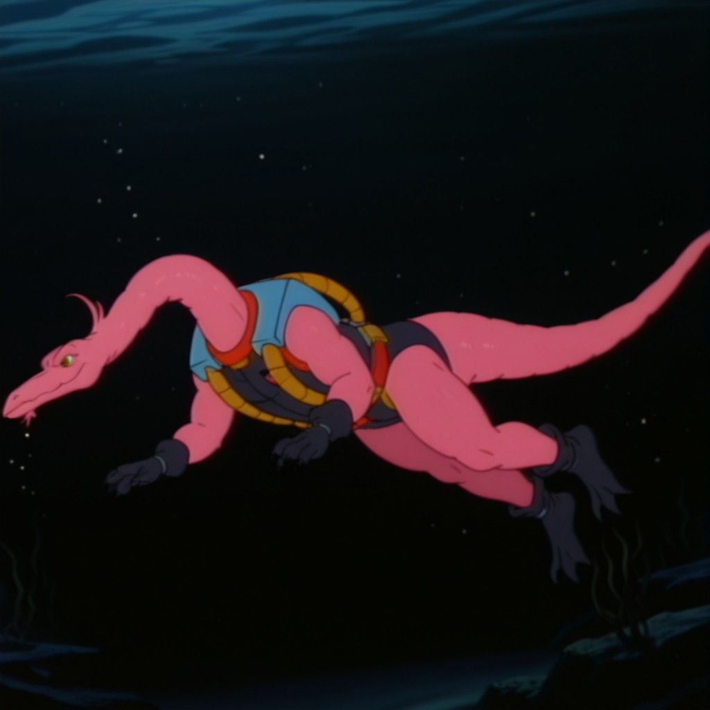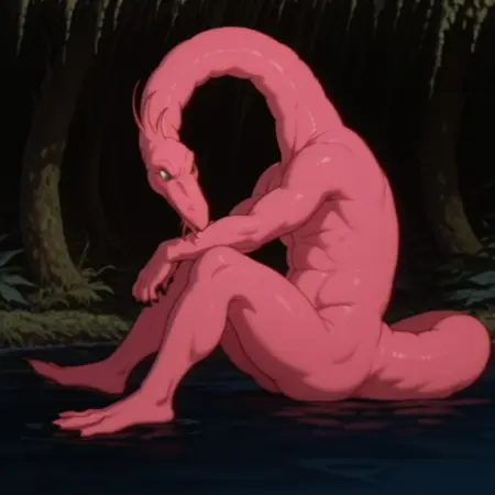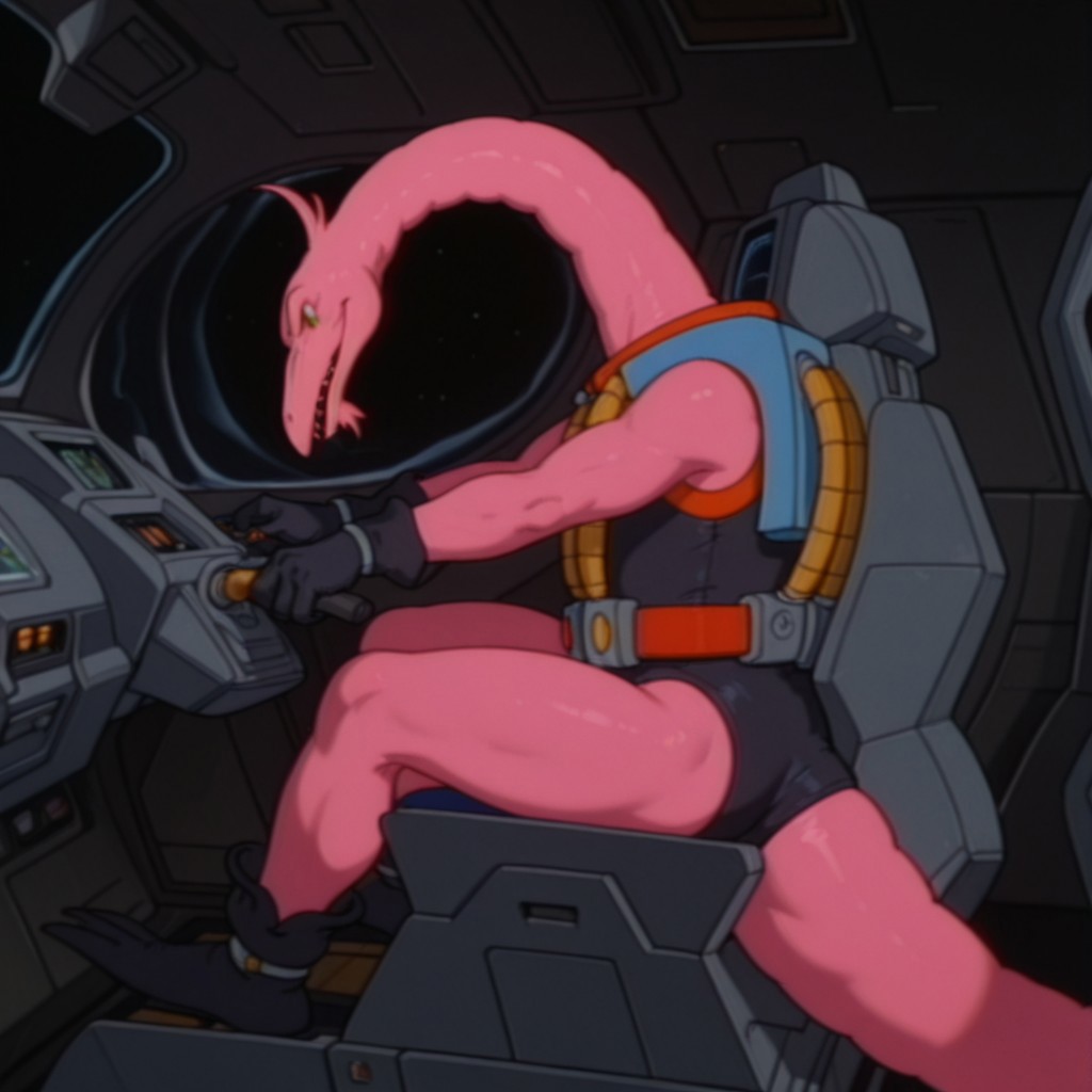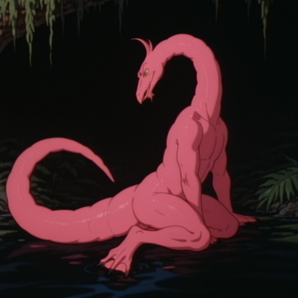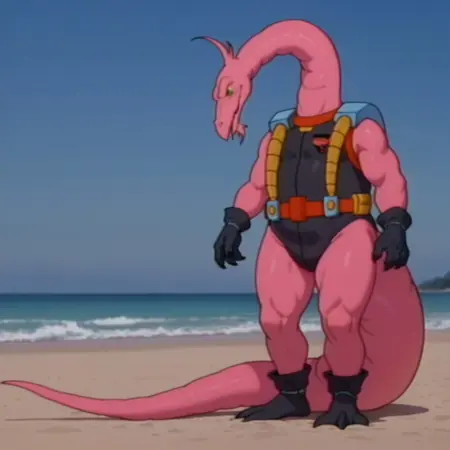 PlesioDsil, anthro, male, plesiosaurus, pink skin, green eyes, long neck, black bodysuit, red trim, sleeveless, bare legs, black gloves, claws, black boots, red belt,