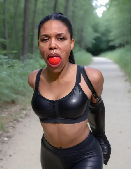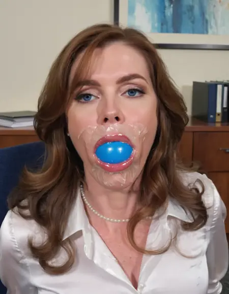 Model for images of woman gagged with clear tegaderm tape with rubber stress balls in their mouths.