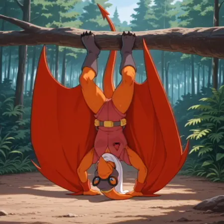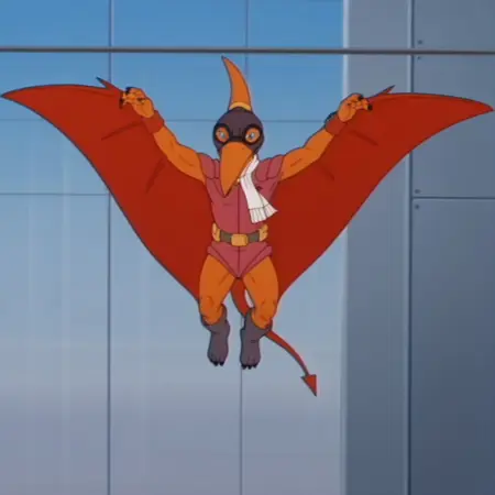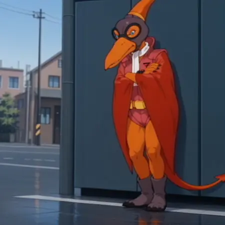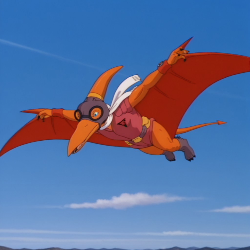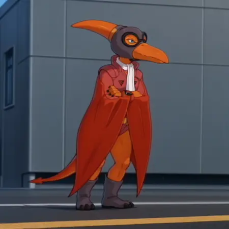 DactylDsil, anthro, male, pterosaur, orange skin,blue blue eyes, winged arms, dark orange wings, red leotard, white scarf, black goggles, grey aviation helmet, grey boots, dark orange wristbands, grey belt, yellow belt pouch,