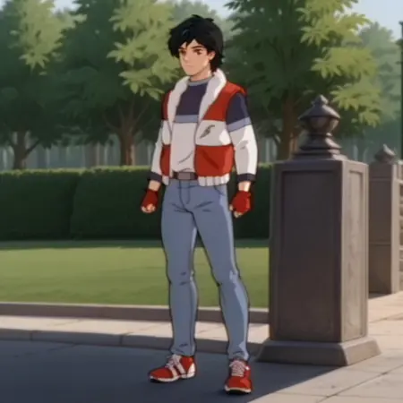 striped shirt, long sleeves, red fingerless gloves, blue jeans, red and white shoes,