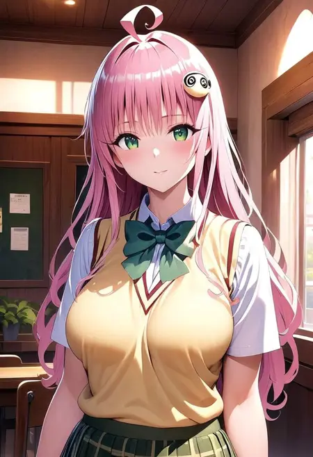 트리거 단어: lala_a, 분홍색 머리카락, 긴 머리카락, ahoge, 머리장식, 녹색 눈, 리본 넥타이, 노란색 학교 유니폼, 짧은 소매, 주름스커트,