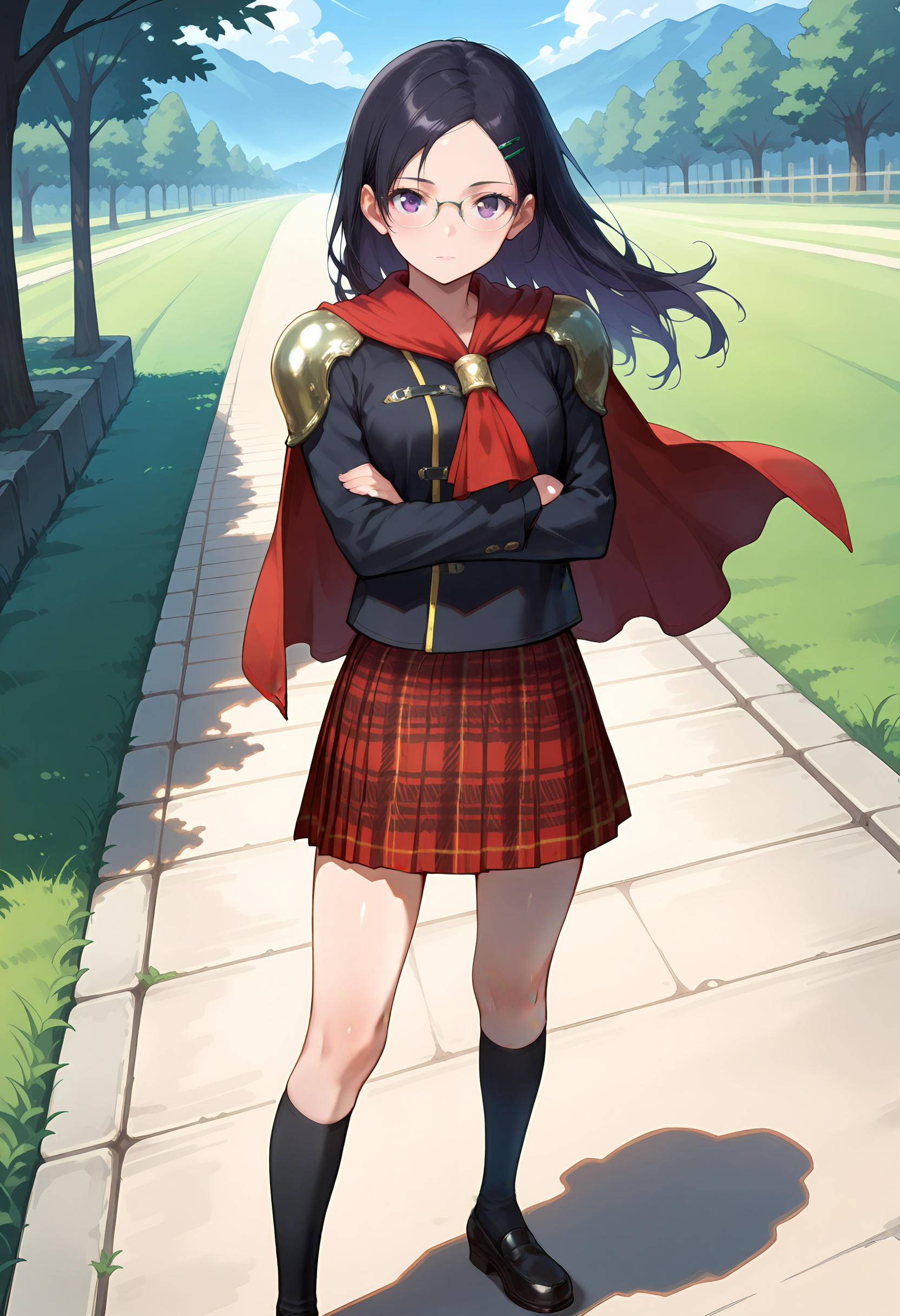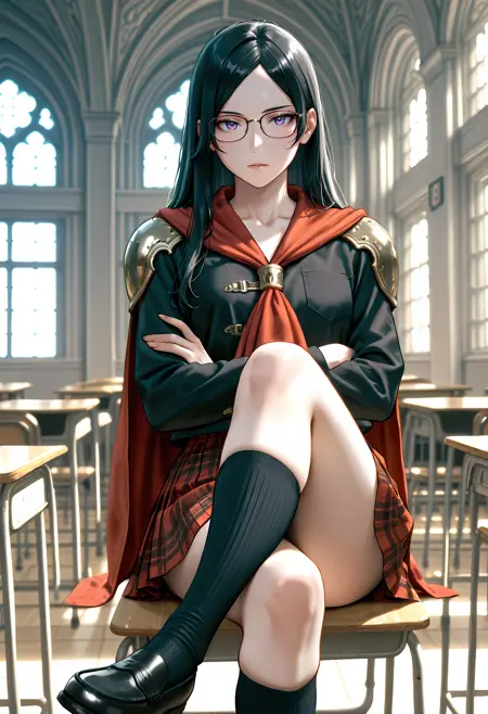 fft0-queen, black hair, parted bangs, purple eyes, glasses, school uniform, black shirt, long sleeves, collarbone, shoulder pads, cape, skirt, plaid skirt, pleated skirt, knee socks, black socks, loafers
