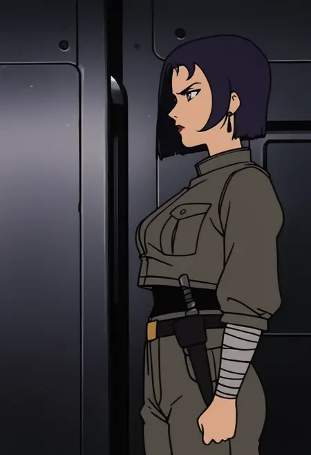ab3l1a, purple hair, short hair, single earring, purple eyes, lipstick, military uniform, cropped military jacket, military pants, belt, bandages, bandaged forearms, black shirt under military uniform, military uniform over black shirt,