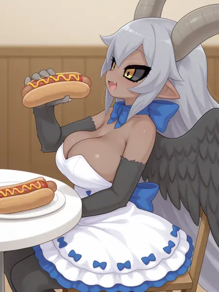 사바스, 회색 머리카락, 긴 머리카락, 노란 눈, 검은 공막, 뾰족한 귀, 뿔, 날개, 검은 날개, 몬스터 걸, 검은 피부 여자, 검은 피부, 키 작음, 작은 체형, 큰 가슴, 털이 난 팔, 털이 난 다리, 갈퀴발, 젖가슴, 드레스, 흰 드레스, 리본넥타이, 파란 리본, 어깨 밖 드레스,
