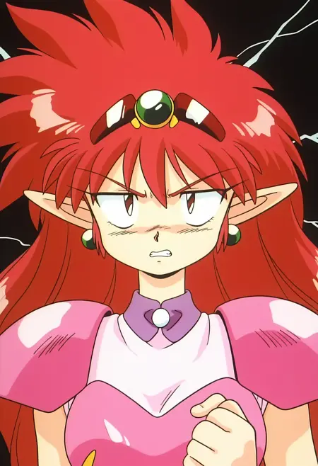 외모: 라무네EX밀크, 빨간 머리, 매우 긴 머리, 스파이크 머리, 보석, 관모, 원형 관모, 뾰족한 귀, 앞머리, 갈색 눈, 보석, 귀걸이, 중간 크기의 가슴