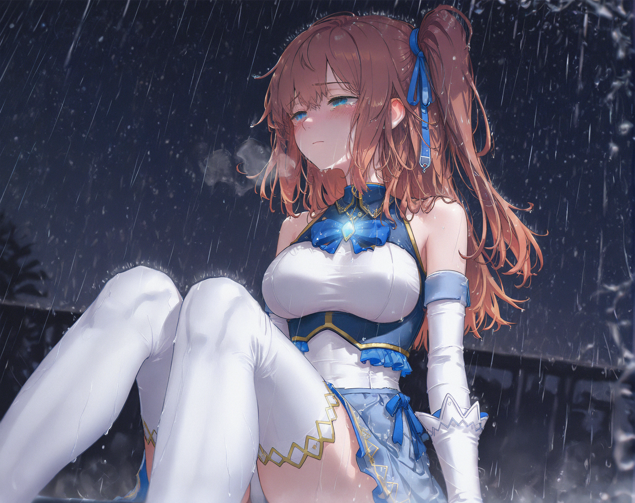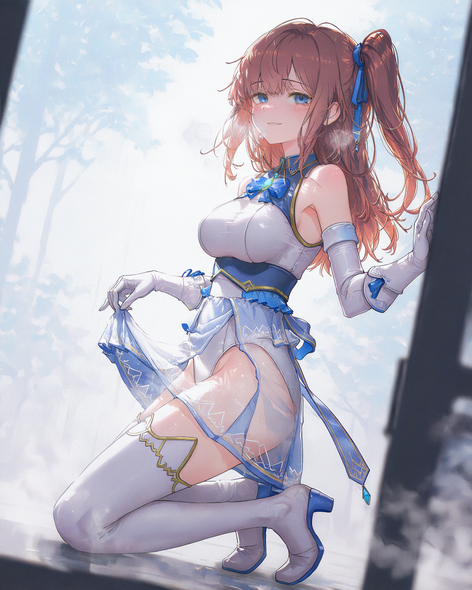 blue ribbon, hair ribbon, one side up ,