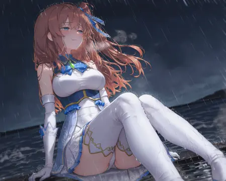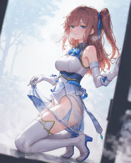 cele_mag_dress, 흰 레오타드, 흰 장갑, 흰 허벅지 긴 양말, 팔꿈치 긴 장갑,