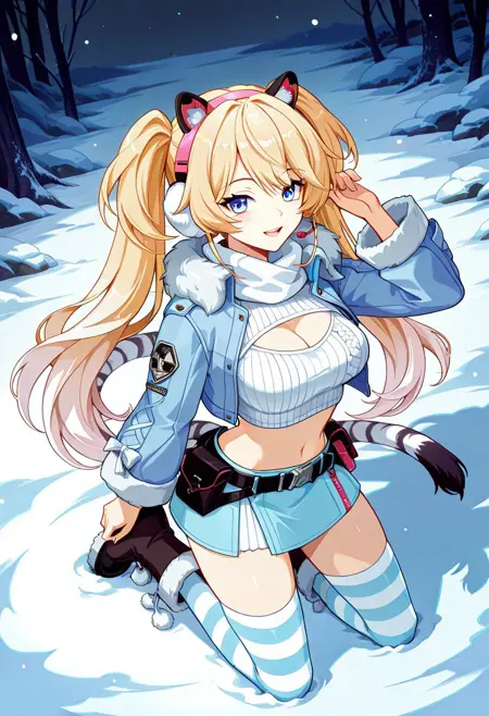 1girl, Michele-Winter-kitten, blonde hair, twintails, long hair, bangs, blue eyes, white tiger tail, striped thighhighs, fur trim, fur-trimmed boots, fur-trimmed jacket, striped, blue jacket, blue skirt, midriff, navel, belt pouch, shoes, cropped jacket, open jacket, cropped sweater, white sweater, cleavage, open-chest sweate, clothing cutout, white scarf, earmuffs, pink headset,