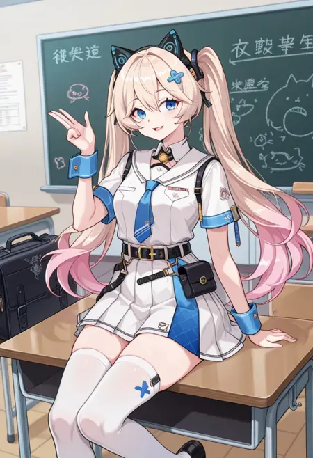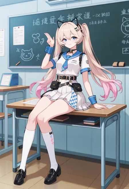 1girl, Michele-player-volunteer, twintails, gradient hair, blue eyes, blonde hair, hair between eyes, full_shot, pink hair, (pink tail:1.2), long hair, animal ear headphones, cat ear headphones, fake animal ears, skirt, headphones, necktie, belt, multicolored hair, pleated skirt, shirt, long sleeves, open mouth, white skirt, hair ornament, white shirt, hat, socks, legs, white socks, black footwear, shoes, kneehighs, white headwear, sailor colla