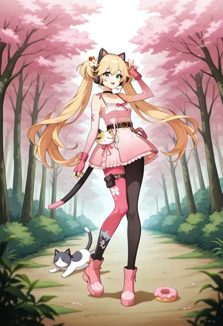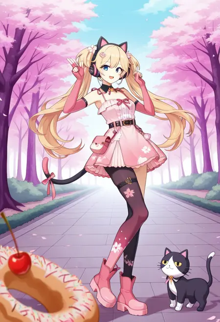 1girl, michele-sweet-tooth-paradise, blonde hair, twintails, long hair, bangs, blue eyes, fake animal ears, animal ear headphones, hair ornament, pink gloves, fingerless gloves, elbow gloves, pink dress, spaghetti strap, sleeveless , bare shoulders, frilled dressfood print, belt, pink ribbon, pouch, short dress, pink footwear, (single leg black pantyhose, asymmetrical legwear:1.2), thigh strap, cat tail, stuffed cat, cherry, doughnut,