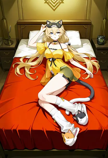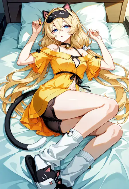 1girl, Michele-Feline-Energy, blonde hair, low twintails, long hair, bangs, hair between eyes, blue eyes, sleep mask, mask on head, yellow dress, short sleeves, see-through, underwear, black short shorts, black choker, bell, cat tail, white loose socks, animal slippers, bare shoulders,