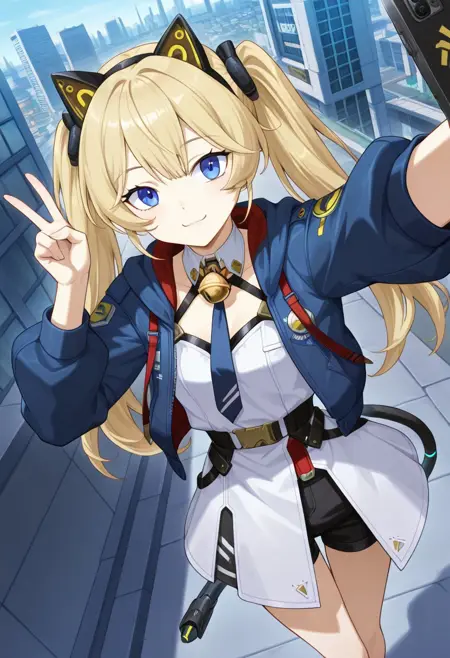 1girl, Michele-default, blonde hair, twintails, long hair, bangs, blue eyes, bell, neck bell, fake animal ears, blue jacket, open jacket, shorts, white dress, necktie, cat tail, mechanical tail,