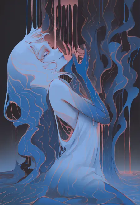 1girl, solo, liquid, surreal, sketch, profile, abstract, no lineart