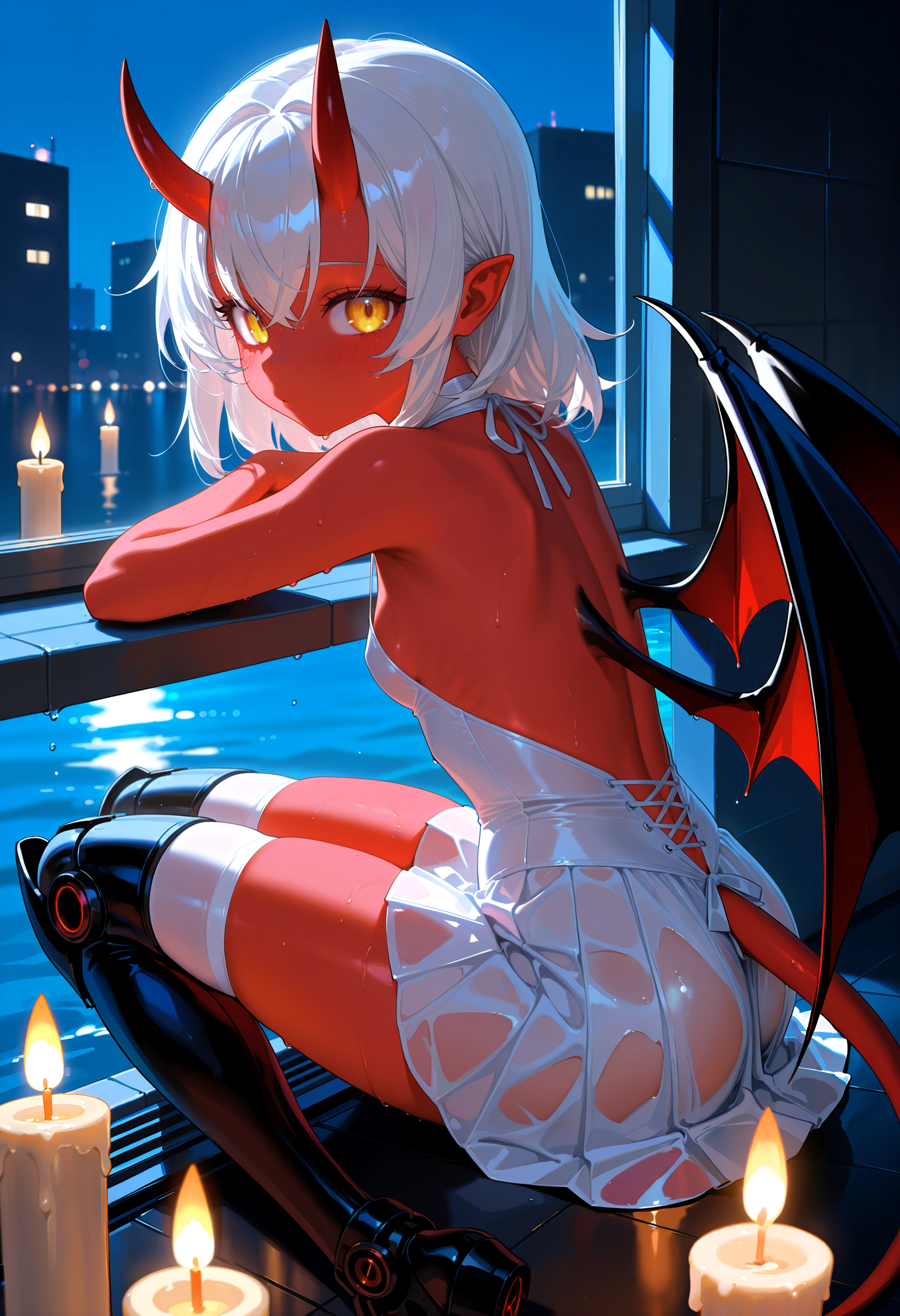 1girl, solo, lora:ill\YUME-01__夢-01__616_minutes YUME-01, cyber succubus, petite, small petite breasts, short hair, cute face, white short skirt
