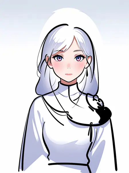 긍정적 키워드: Minimalism, minimalist line drawing, portrait, white_background, masterpiece, best quality:1.2, 1male, ((girl:1.5)), message white hair, portrait, cold attitude, best light and shadow, day, depth of field, smile,