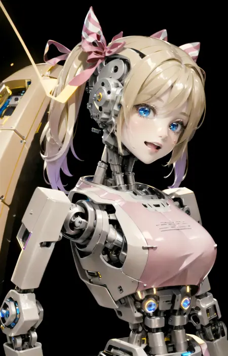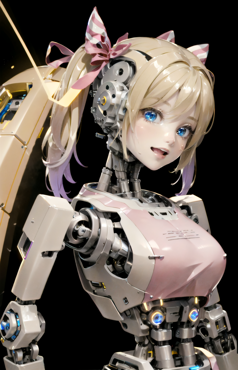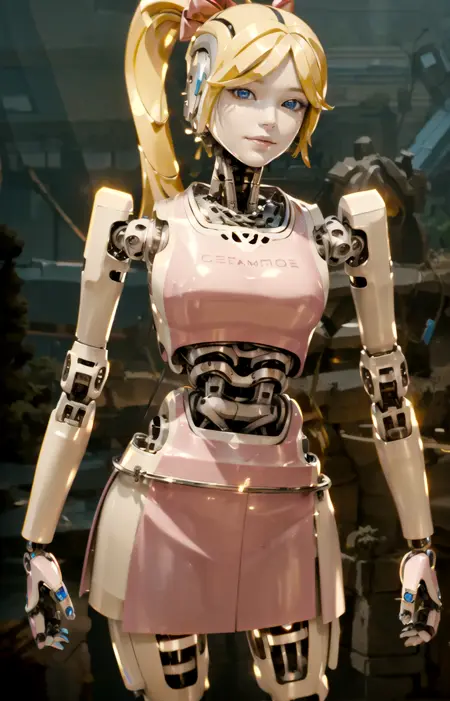 아마도 'beautybot, kingsman 2, robot joints, android, robot girl, robotization, robotic face, mechanical hair, machine, no humans, glowing pupils, porcelain skin, photorealistic' 등의 프롬프트를 사용하면 양질의 그림을 생성할 수 있지 않을까 합니다.