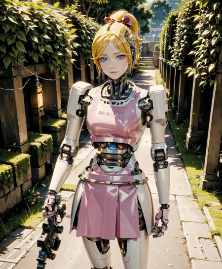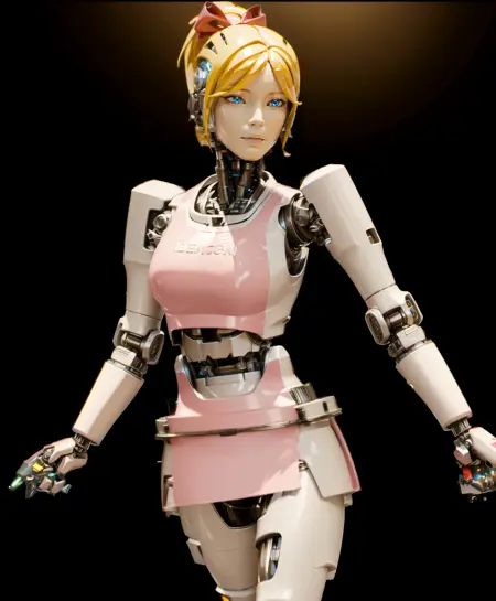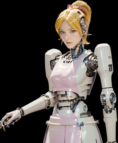 아마도 'beautybot, kingsman 2, robot joints, android, robot girl, robotization, robotic face, mechanical hair, machine, no humans, glowing pupils, porcelain skin, photorealistic' 등의 프롬프트를 사용하면 양질의 그림을 생성할 수 있지 않을까 합니다.