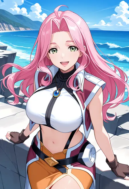 sleeveless jacket, white crop top, pendant, brown fingerless gloves, navel cutout, belt, suspender skirt, orange skirt, pencil skirt, white back skirt, large breasts, pink hair, hair intakes, long hair, green eyes, makeup, lips
