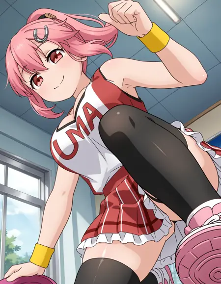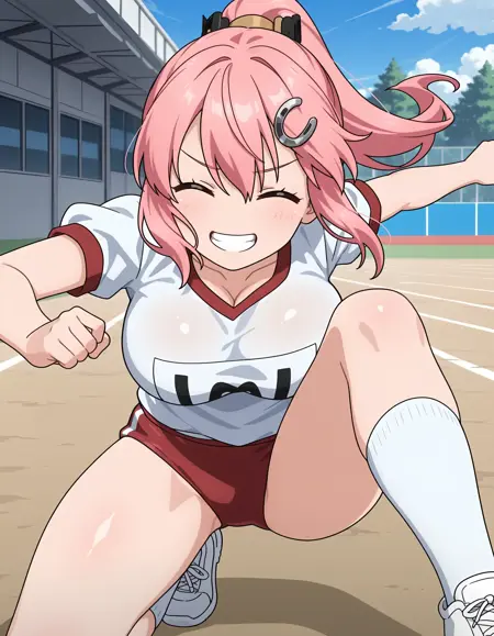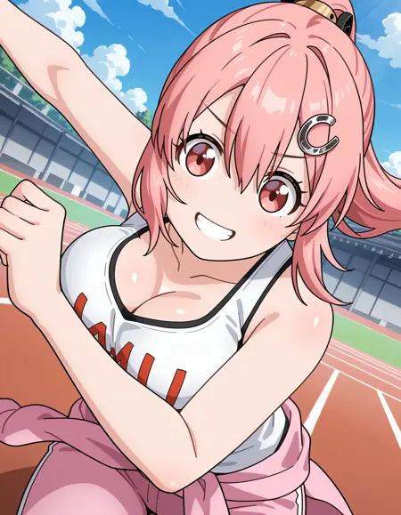 g1-derby,hanyuumako,pink hair,hair between eyes,pink eyes,ponytail,sidelocks,large breasts,cleavage,hair ornament