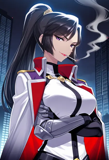 coat, military uniform, white uniform, white pants, belt, single mechanical arm, brown fingerless gloves, large breasts, black hair, ponytail, hair ornament, purple eyes, red lips