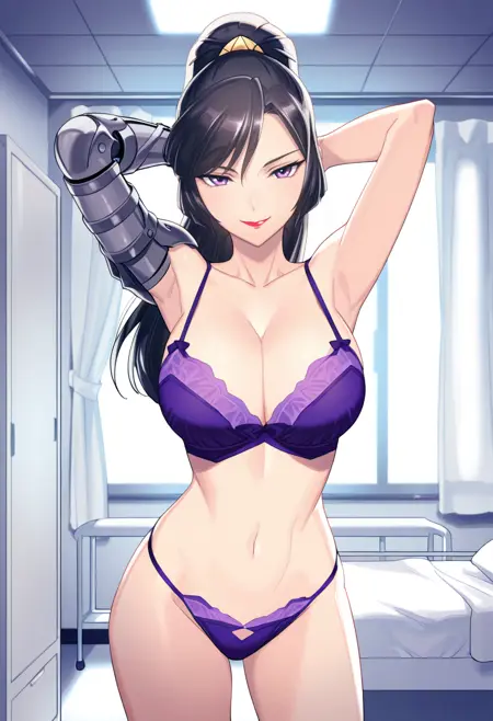bodysuit, single mechanical arm, long sleeves, bare shoulders, cleavage cutout, navel cutout, black panties, thigh bandage, purple thighhighs, large breasts, black hair, ponytail, hair ornament, purple eyes, red lips