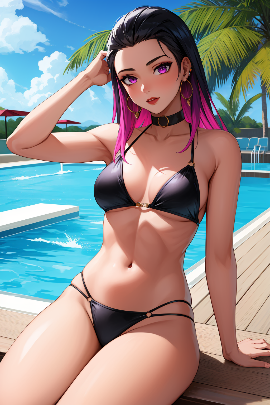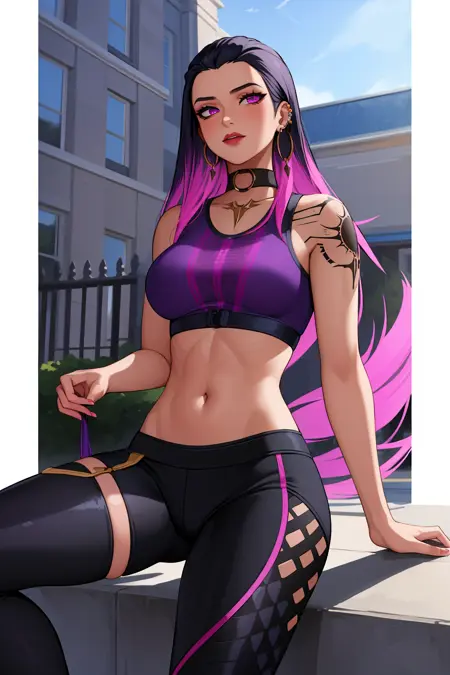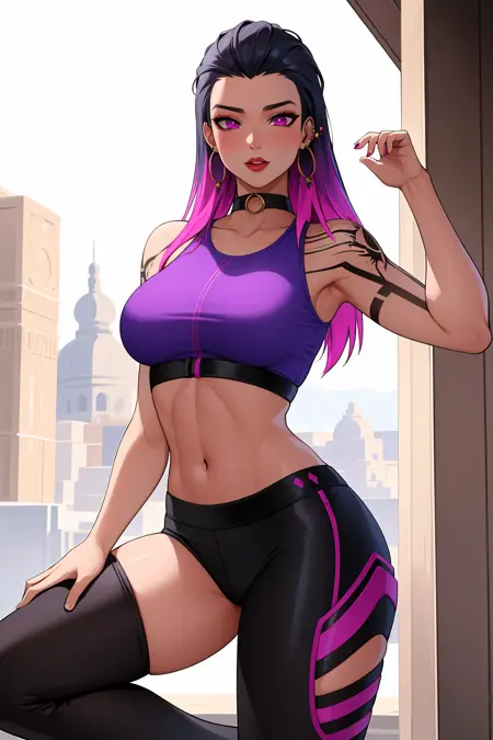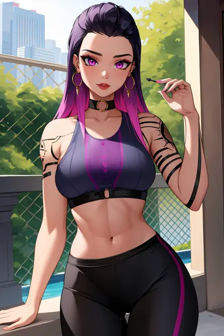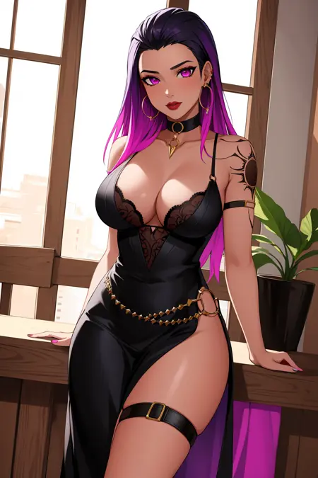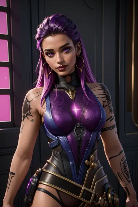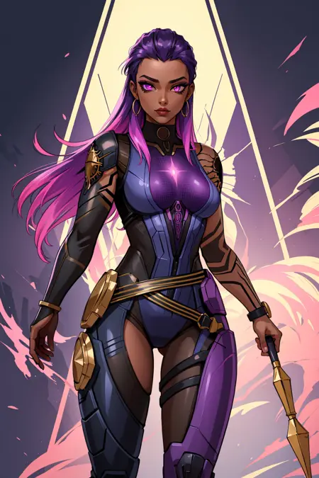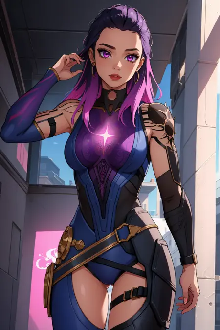 tags: reyna, 1girl, bodysuit, multicolored hair, purple eyes, dark skin, tattoo