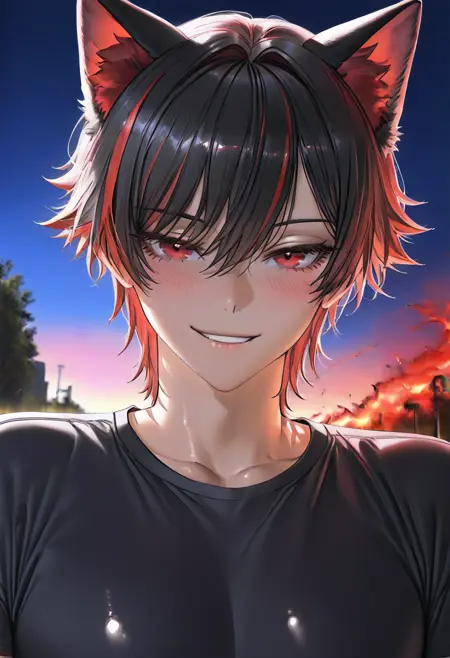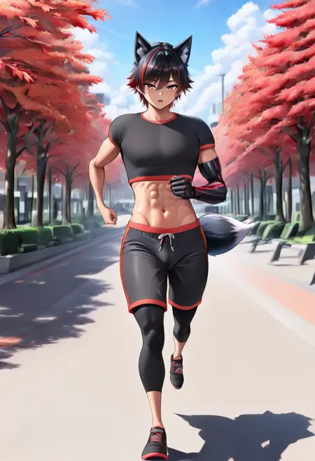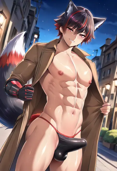 robinaki4, black fox tail, (single mechanical arm:0.8), red eyes, multicolored hair, streaked hair, red tipped tail, abs, muscular,