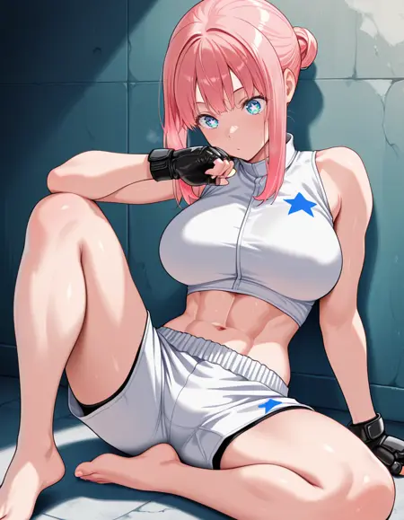 Hongou Hina, 1girl, pink hair, gloves, blue eyes, navel, fingerless gloves, midriff, star \(symbol\), shorts, barefoot, black gloves, white shorts, crop top, star-shaped pupils, medium hair,single hair bun, sleeveless,abs,