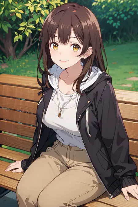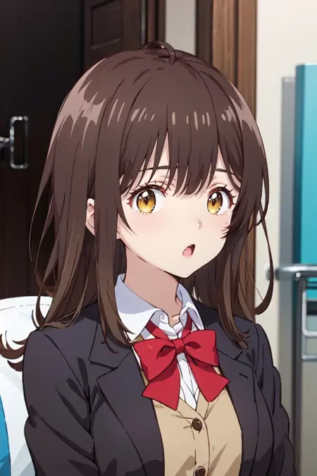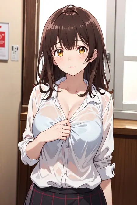 For her original outfit use the tags: pikkysayu, 1girl, solo, looking at viewer, brown hair, long hair, bangs, brown eyes, yellow eyes, breasts, large breasts, skirt, school uniform, shoes, bow, socks, loafers, bowtie, jacket, pleated skirt, long sleeves, shirt, collared shirt, blazer, kneehighs, blush
