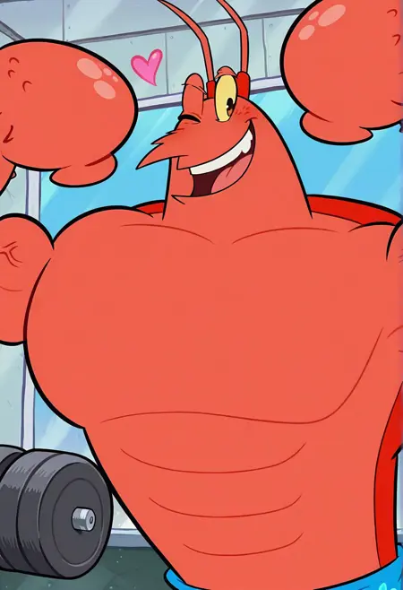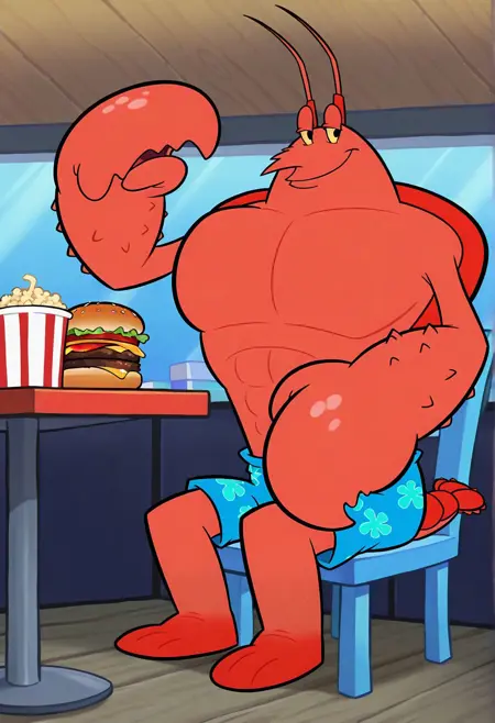 Larry_The_Lobster,no nipples,no humans,antennae,yellow sclera,hawaiian shorts,blue background,
