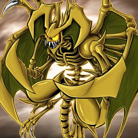 winged skeletal creature, golden skin, giant, monster, no humans, floating in the sky, towering figure, glowing crimson eyes, large dark green bat wings, 2 thumbs on bat wings, sharp claws, complex design, feet with claws distributed as if they were a 3-toed bird, only, tail, blue gem on the forehead under a detail of the head that passes over it straight where it looks, 2 horns on the sides of the head in the shape of bat wings with dark green membranes that connect to the head, half-pincer and half-finger hands, sharp teeth,