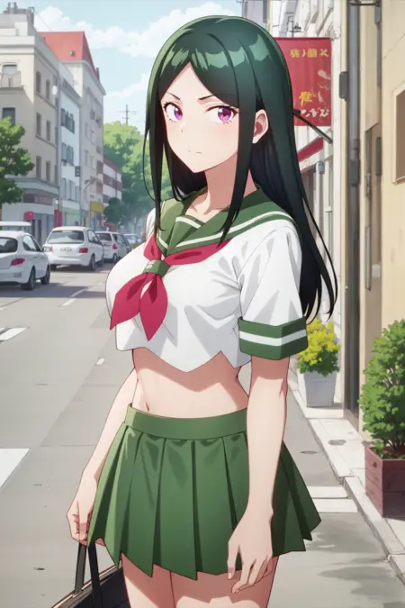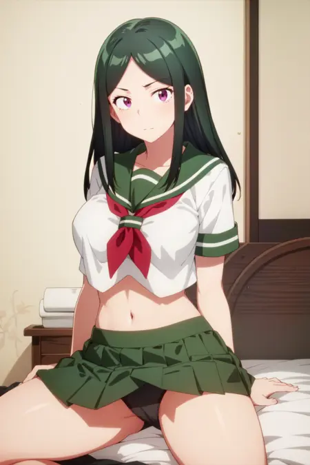 You can use the maou transformation using the following tags: maou1, school uniform, serafuku, green skirt, pleated skirt, long hair, green hair, short sleeves, midriff, purple eyes, crop top, large breasts.