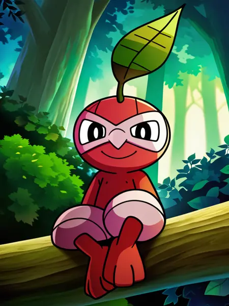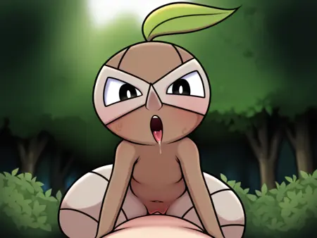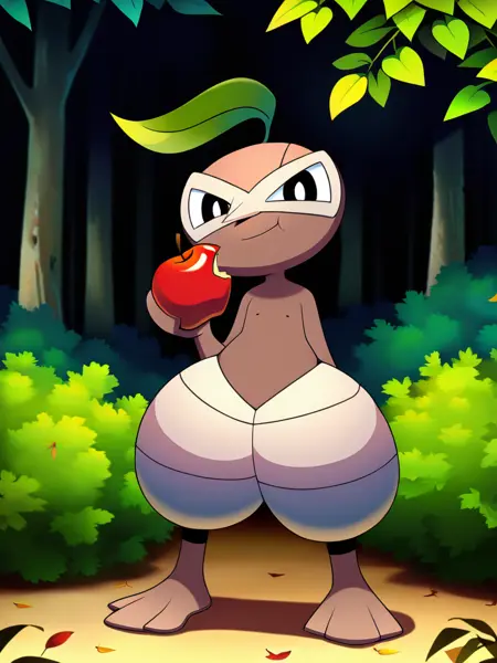 Prompt: nuzleafpony, pointy nose, mask, nipples, black eyes, leaf, bright pupils, white pupils, navel, pokemon \(creature\)