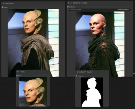 It takes your original image, extracts the face, automatically creates an inpaint mask, creates the face embedding, with selected denoise strength it rewrites everything in mask pass areas.