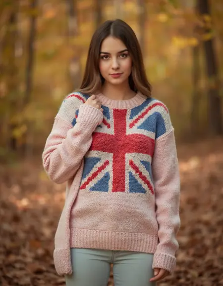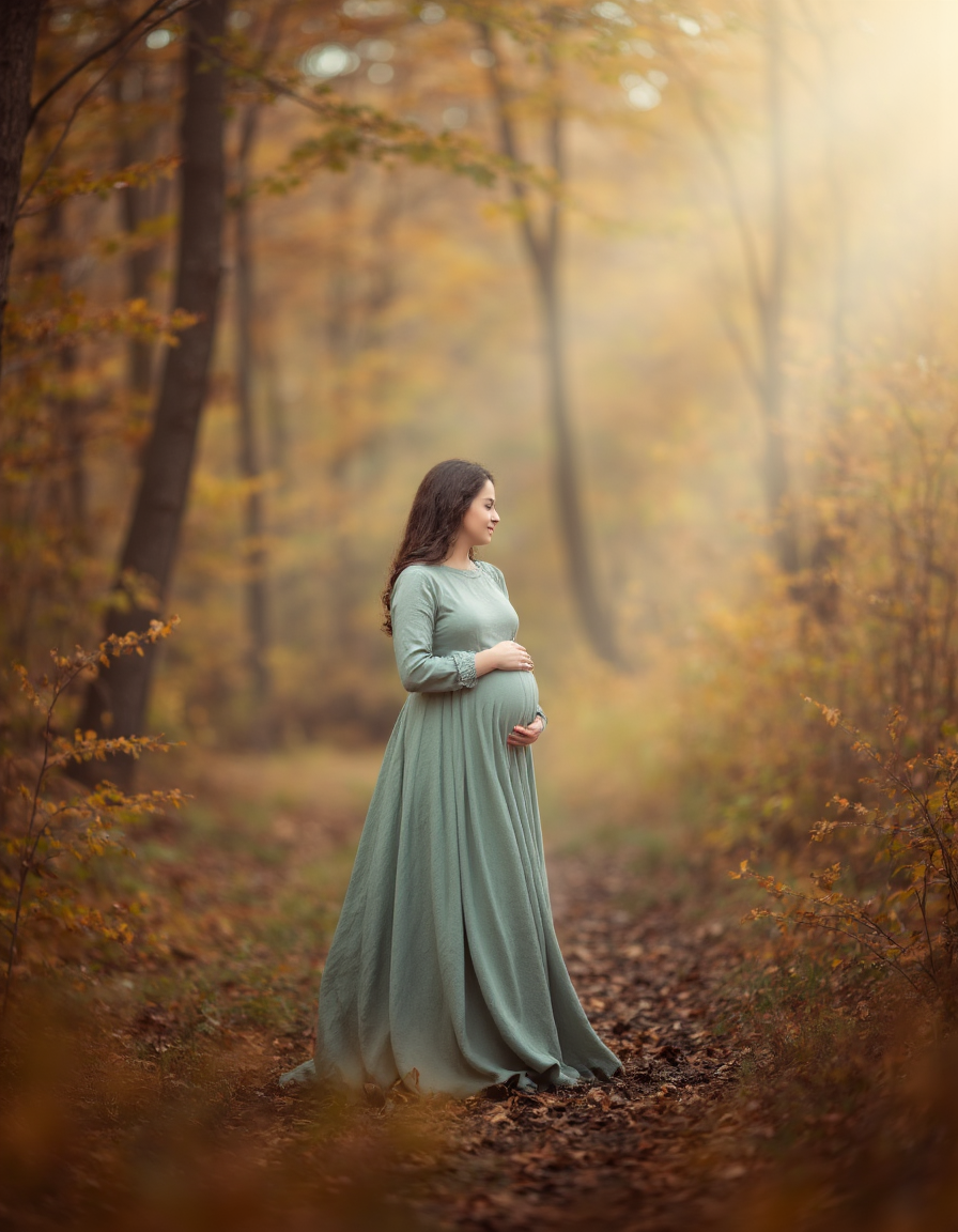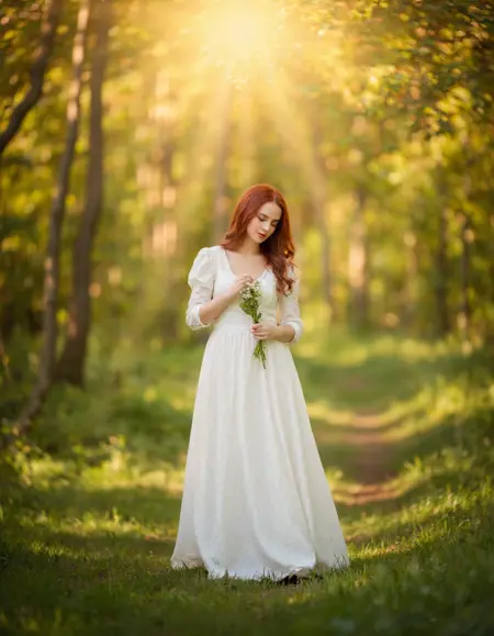 長い金髪の少女が薄いオリーブ色のドレス、灰色のタイツ、茶色のブーツを着用し、チェック柄のショルダーバッグを持ち、陽の光が差し込む森の芝生の小道に立っている様子。背景には黄金色とオレンジ色の秋の葉が広がり、シーン全体に温かみのある光を放っている。lilia-alvarado のスタイルで