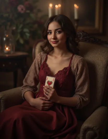 赤と緑のチェック柄のドレスを着た少女が、赤い靴下と蝋燭で飾られた暖炉の横の青と赤のストライプ模様のアームチェアに座っている様子。周囲には温かい光を放つ装飾されたクリスマスツリー、プレゼント、テディベアが広がり、すべてが豊かで温かい色調の居心地の良い部屋に設定されている。lilia-alvarado のスタイルで