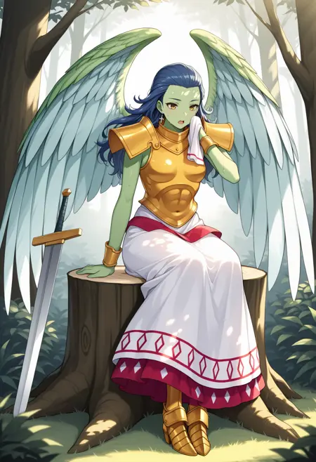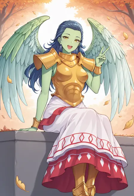 デフォルトの外見: gaby、青い髪、後ろに流した髪、長い髪、緑の肌、黄色い目、十字型のイヤリング、金色の鎧、胸甲、肩甲、腕甲、白いスカート、重ねたスカート、長いスカート、羽根の翼、装甲ブーツ