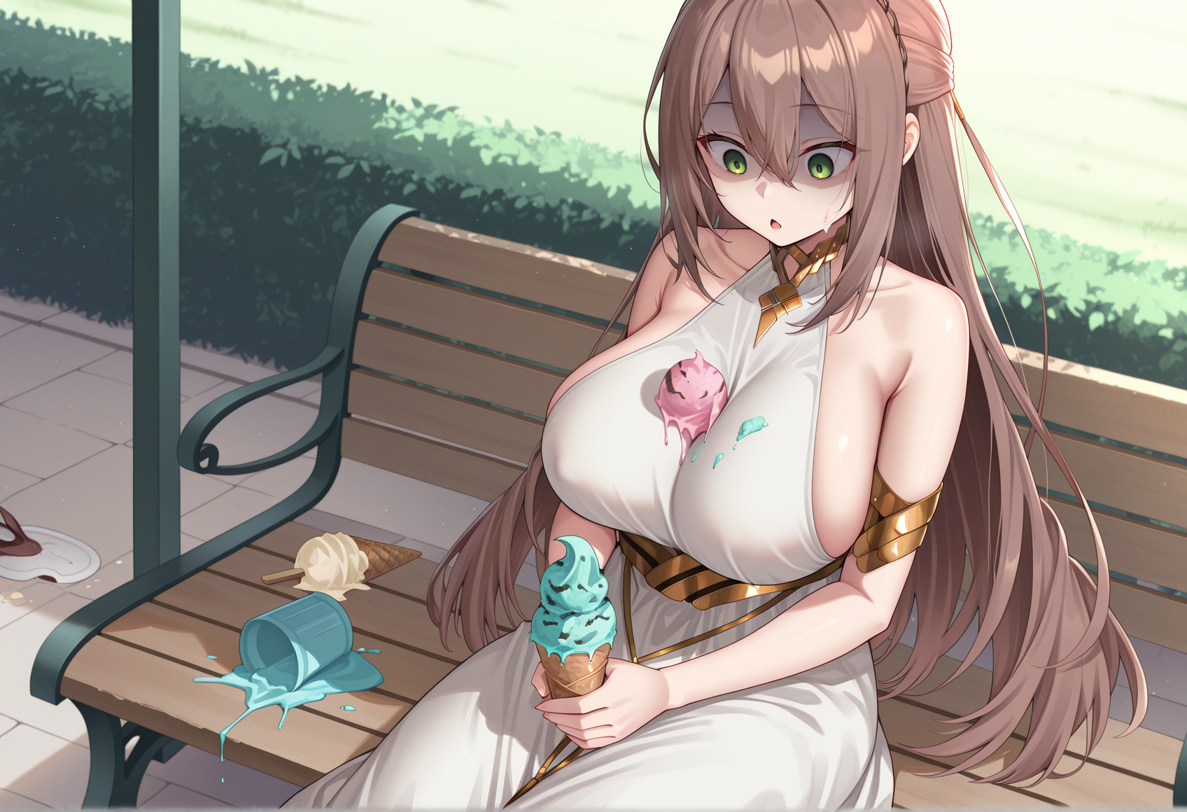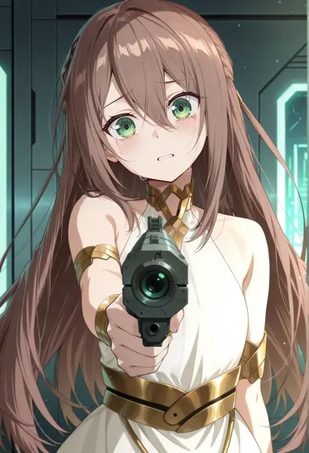 brown hair, long hair, hair ornament, green eyes, neck ring, jewelry, armlet, ancient greek clothes, white dress, bare shoulders