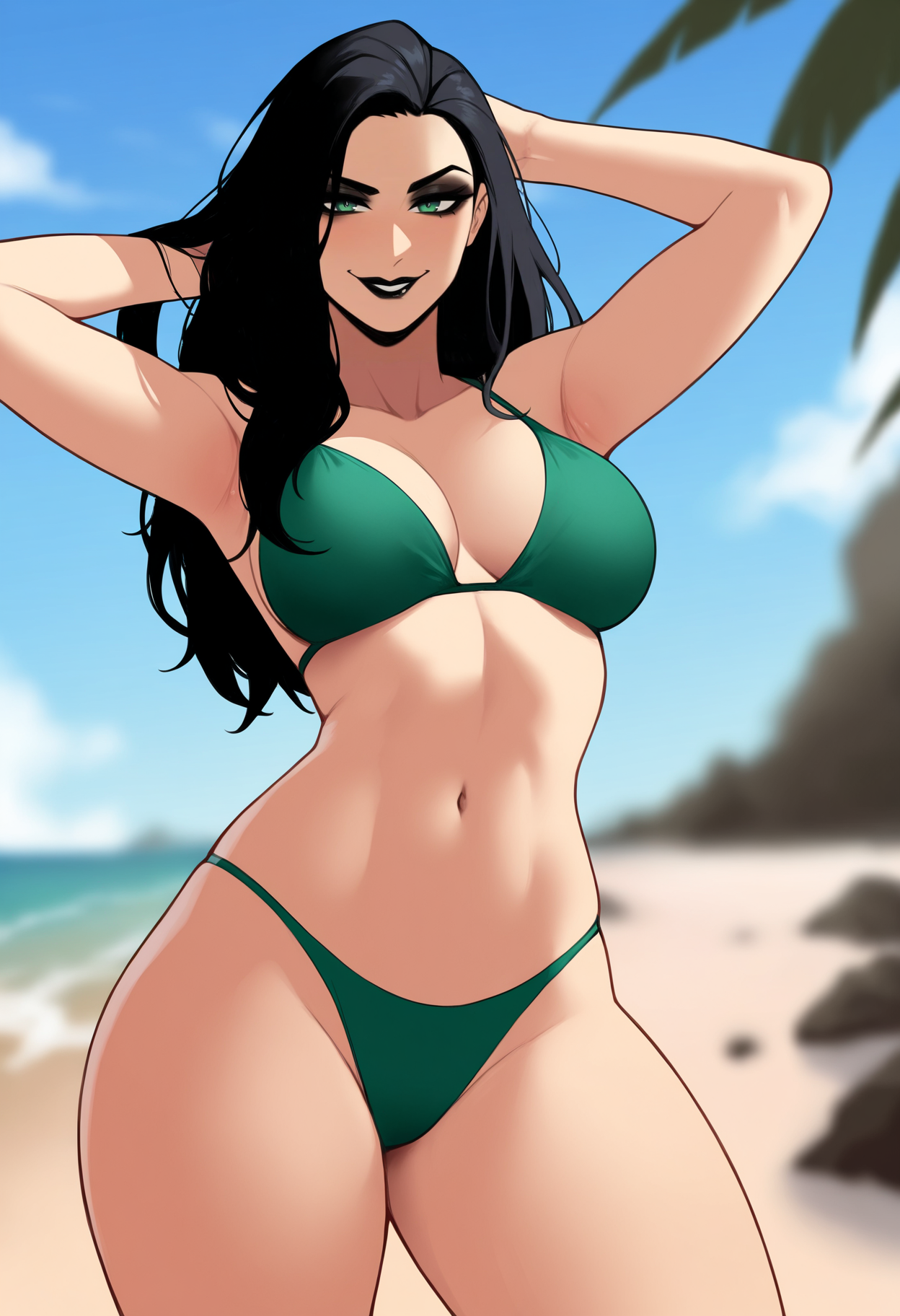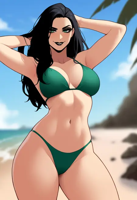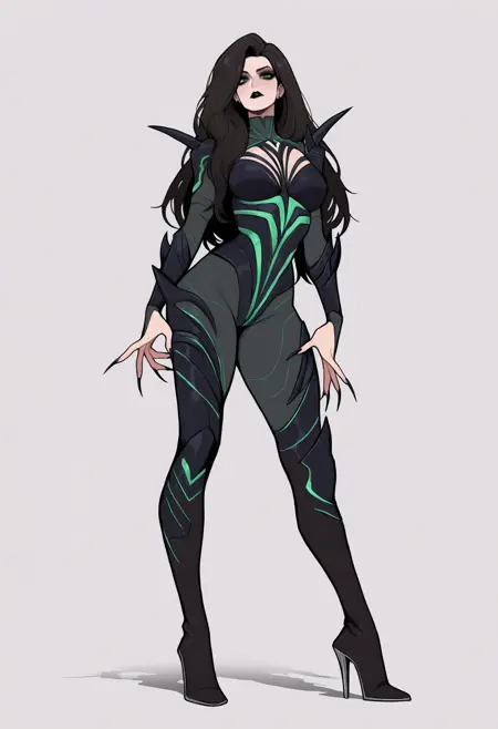 Basic prompts : 1girl, helaodinsdottir, black hair, long hair, green eyes, black lips